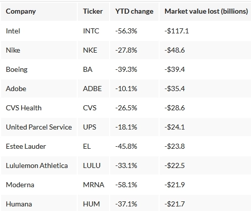 今年の米国S&P500最悪の種目10個
