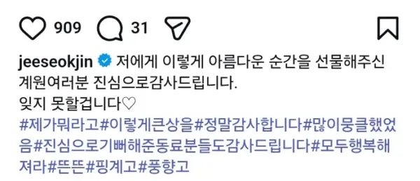 言い訳部門大賞を受賞したチ・ソクジンのインスタグラム