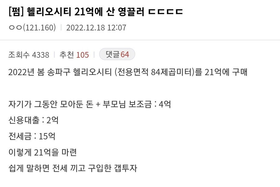 ●4億ウォンで21億ウォンの住宅を買ったヨンクル族