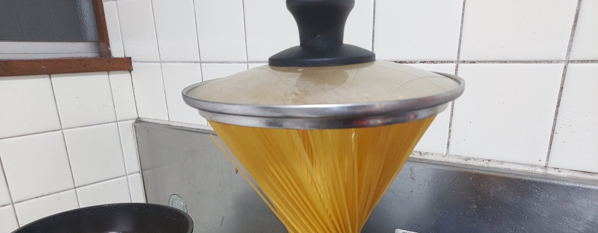 パスタ麺を鍋に入れて蓋を載せてください。