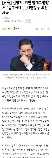キム・ビョンギ国会議員、電報で「申し訳ない」と…大韓航空の儀礼謝罪
