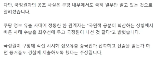 【独占】クーパン「」「「政府と協力し指示を受けました」」「」…政府機関は「国家情報院」