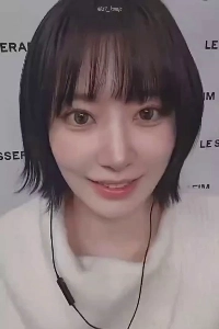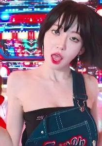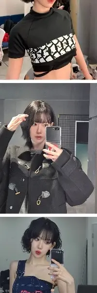 Rセラフィムショートヘアの桜。流れるデニムサスペンダー黒チューブトップ上部の谷間