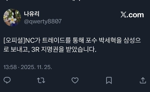 三星、パク・セヒョク捕手を獲得