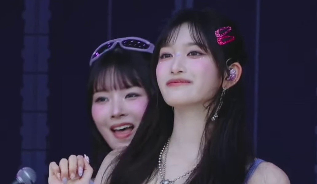 デニムチョミニ片足高く上げるルセラフィムカズハへそ太もも