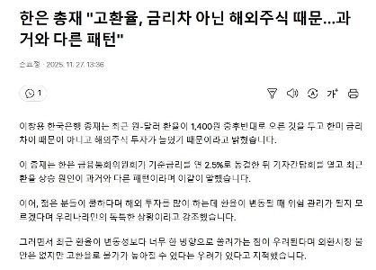 韓国銀行総裁「為替レートが高いのは金利差ではなく、外国株のせいだ」