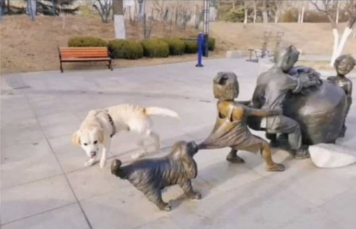 銅像に力を貸すワンちゃん
