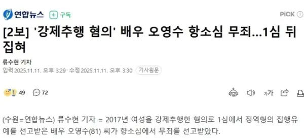 【速報】俳優オ・ヨンス、「強制性交」容疑、控訴審で「無罪」に変更