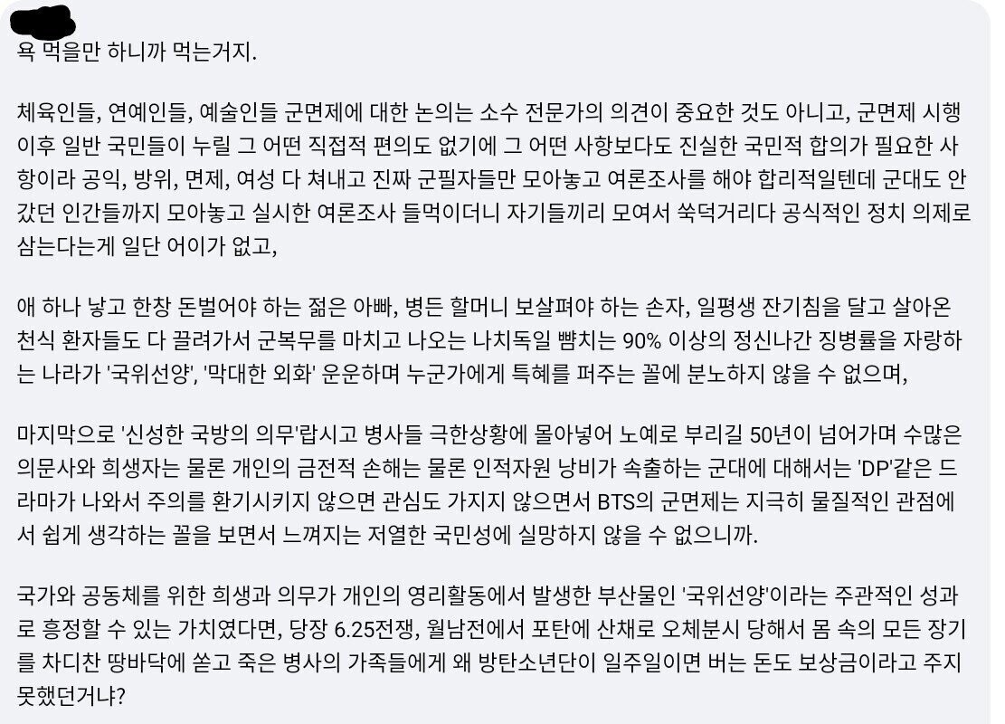 Bts軍免除関連のコメントの一つ