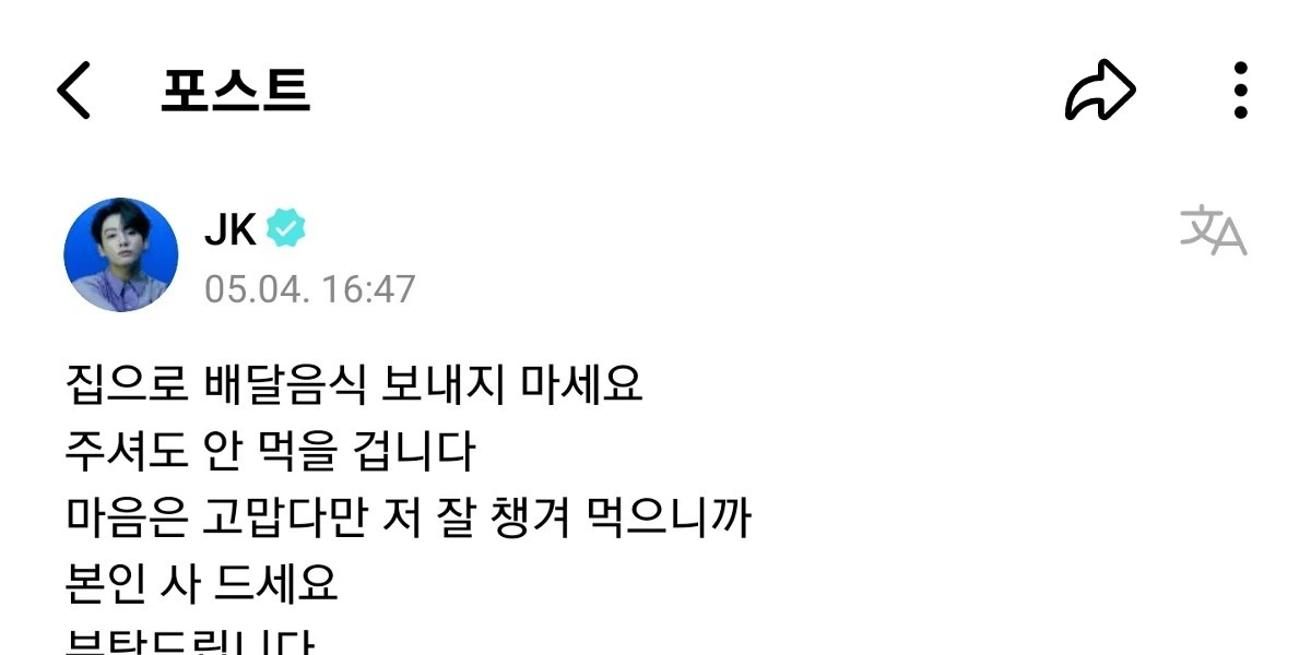 家に出前を取るのはやめてほしいと コメントしたBTSジョングク