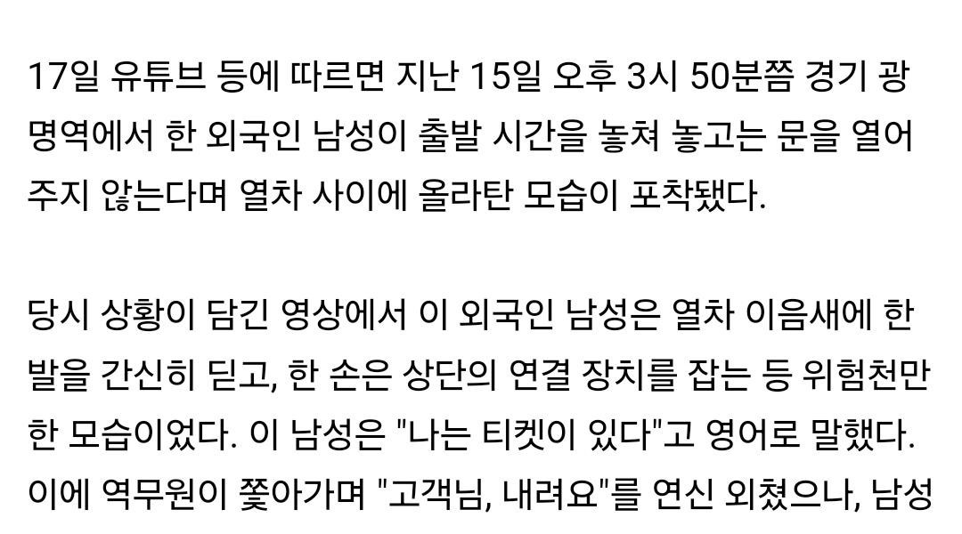 出発したKTXにぶら下がっている外国人を降りろと言うと「私はチケットがある」