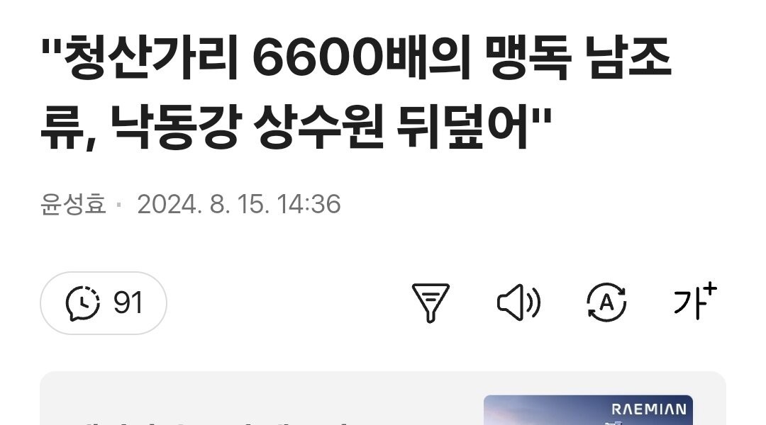 “”””清算ガリ6600倍の猛毒南藻類、洛東江上水源を覆って””””