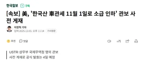 米国、「韓国車に対する関税を11月1日まで遡及引き下げ」と官報で事前公告