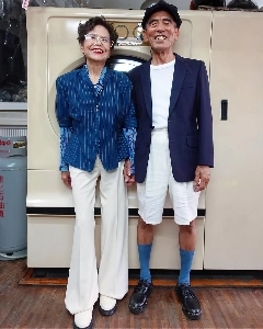 コインランドリーを経営する夫婦が、客が手に取らない洋服を着て写真撮影をする。