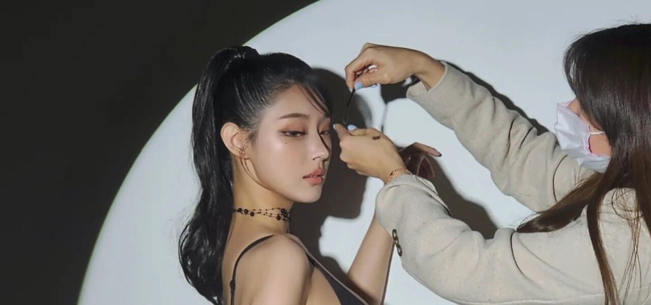 写真撮影をするキム·ガプジュ、ハイレッグ横顔