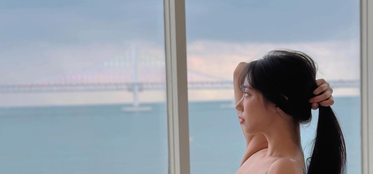 カラフルな空色のビキニを着て鏡セルカの体つきがすごいキョンイ