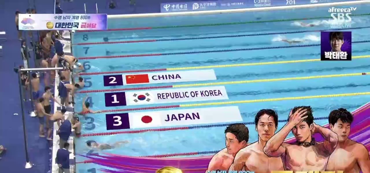 (SOUND)AG男子800m自由形リレー決勝で金メダルを獲得する大韓民国 ぶるぶるぶるぶる