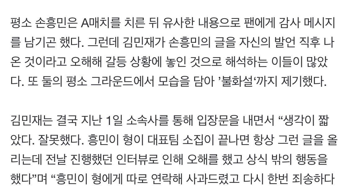 孫興民(ソン·フンミン)、金ミンジェ謝罪口を開いた 「十分誤解する状況、私の好きな選手…···成熟するきっかけになりますように