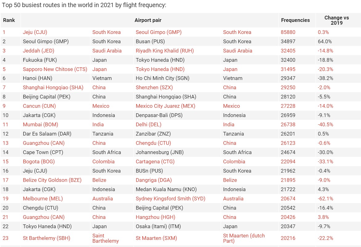 2021年世界で最も混雑した航空路線