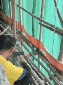 香港の集合住宅の竹足場での喫煙シーン