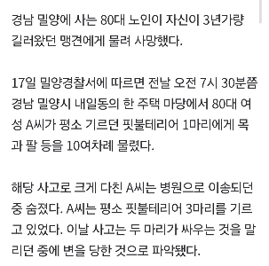 “”””育てていた犬に噛まれて”””” 密陽市の80代女性、凶暴な犬に噛まれ死亡